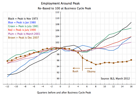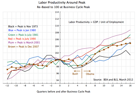 The path of labor productivity in the current downturn and recovery has in fact been within the bounds seen in other downturns and recoveries in the US over the past four decades. If anything, productivity fell somewhat more sharply than in most of the others during the last year of the Bush presidency, and more rapidly than most of the others after Obama took office. And it is this relatively rapid growth of labor productivity during the Obama term, coupled with weak GDP growth (due to fiscal drag and the collapse in housing) which explains the weak recovery in employment.