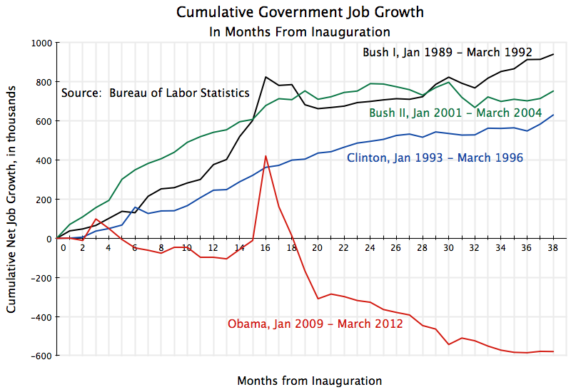 Mitt Romney and Republican Party leaders have repeatedly and emphatically asserted that Obama and the policies of his administration have been terrible for private sector job growth, and that voters should therefore bring back the Republicans and their policies. Indeed, Romney has said his campaign is all about jobs. At the same time, they’ve asserted that government and its bureaucrats have exploded during the Obama years, with this holding back private sector job growth.