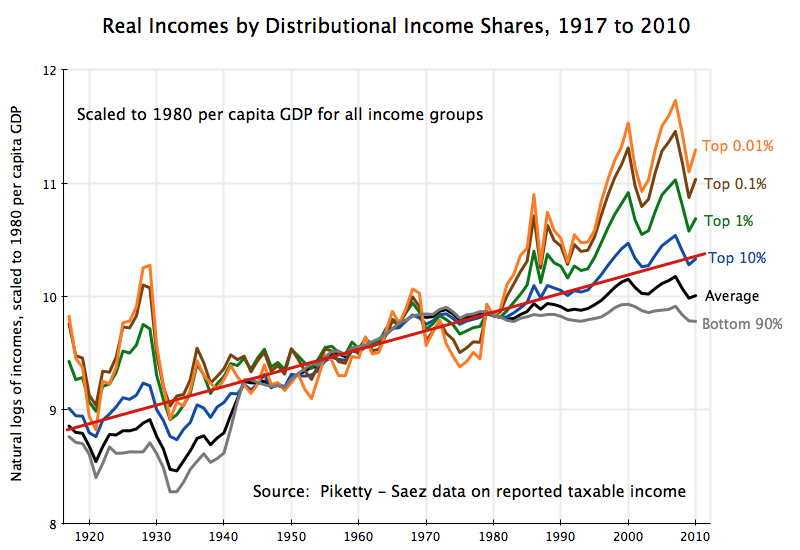 While there has been constancy in the growth of average per capita income, this does not mean that different income groups have necessarily shared equally in that growth. But while such distributional data are not assembled in the regular national income (GDP) accounts, Thomas Piketty and Emmanuel Saez (as part of a larger international effort) have assembled such data based on US income tax returns. The concept of income is not exactly the same. GDP measures the value of all production in any specific year (which ultimately accrues to someone), while tax returns report on taxable household incomes in any year, including realized capital gains but not items such as unrealized capital gains. But over long periods of time they will move similarly. By using US income tax return data, Piketty and Saez are able to arrive at estimates going back to 1917 (and 1913 for some of the data, the year the modern US Income Tax system began). And by using tax return data, Piketty and Saez are able to arrive at accurate figures on the incomes of the very rich (including the top 1%, top 0.1% and top 0.01%), which survey based methods cannot cover well as the numbers in such groups will be relatively small in any broad-based sample.