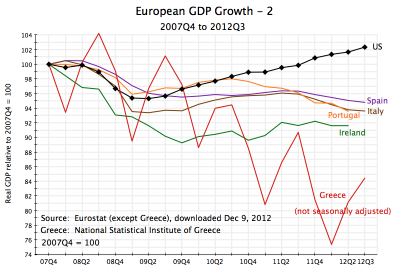 The Republican argument is that adoption of such an austerity program is necessary for the US to be able to continue to grow. Similar arguments were made in Europe. Much of the continent has now adopted austerity programs, either willingly (such as in the UK) or due to pressure from other EU members and in particular pressure from the German government (such as in the cases of Greece, Spain, and Italy). Our aim here is not to review in each case the reasons why the different countries may have chosen to adopt these austerity programs, which as noted was sometimes by policy choice and sometimes as a result of outside pressure. Rather, the aim is to see what the impacts on growth have been since the programs were adopted (for whatever reason).