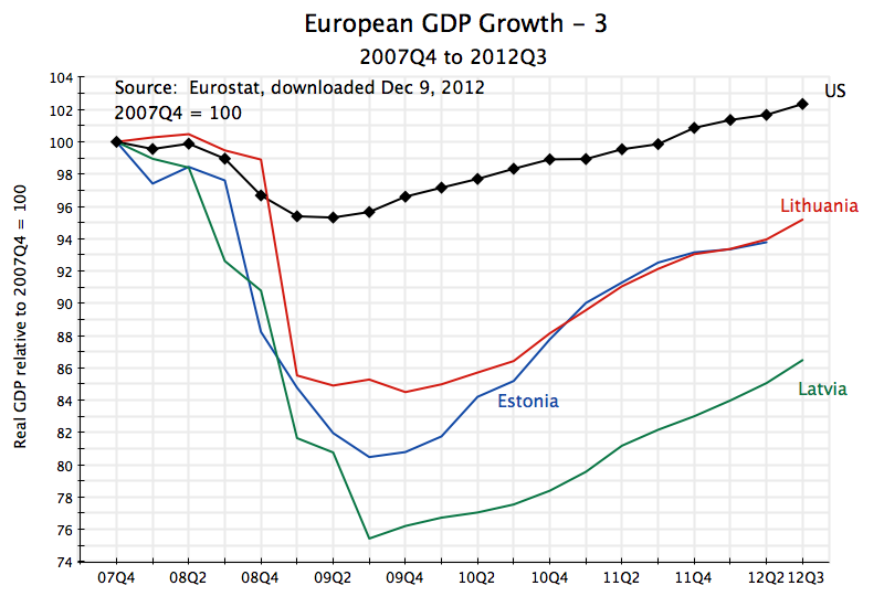 Lithuania and Latvia had more scope in terms of policies they could have followed, since their currencies, while tied (by government decision) to some rate vis-a-vis the euro, are still independent currencies. The governments could have chosen to devalue these currencies, which would have spurred their exports. However, they decided not to, and instead decided to follow programs of severe fiscal austerity. Output collapsed.