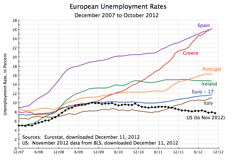 The austerity programs implemented in Europe killed the recoveries which were underway in 2009/2010, and led to double-dip recessions. Unemployment had started to decline in the Eurozone area as a whole, but then rose following the new austerity programs, reaching a rate of almost 12% recently. The US economy has so far fared better, with positive growth and a decline in the unemployment rate from a peak of 10.0% to a rate of 7.7% in November 2012.