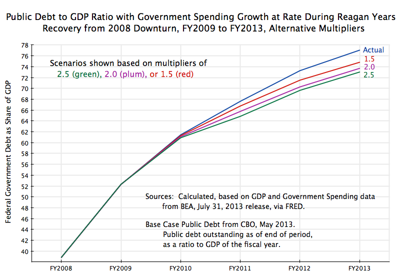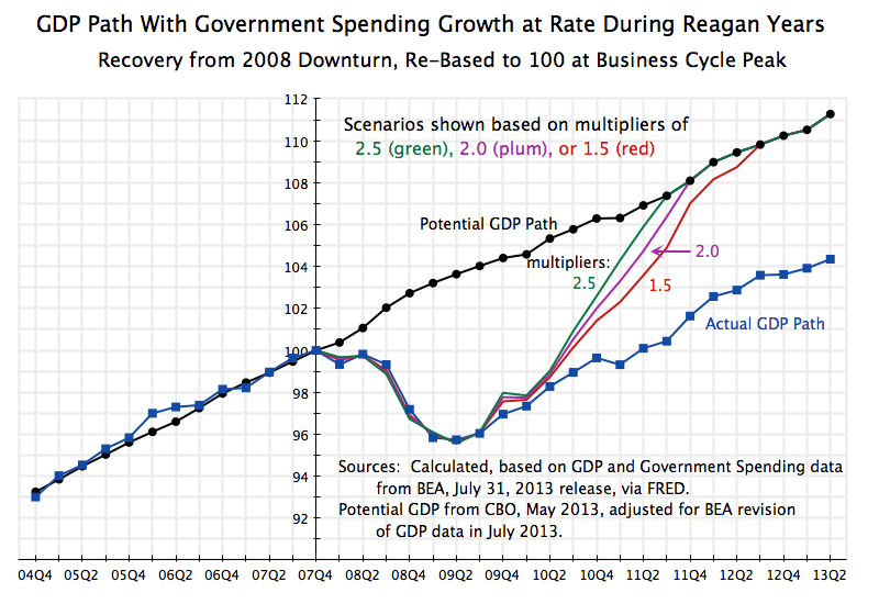 If government spending had been allowed to grow under Obama as it had under Reagan, the economy likely would have reached full employment in 2011 (multipliers of 2.5 or 2.0), or at least by the summer of 2012 (multiplier of just 1.5). That is, the economy would have been at full employment well before the election.