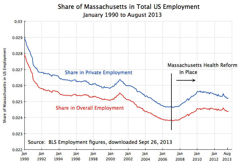 Specifically, what has come to be called “ObamaCare” was modeled on a very similar health reform passed in Massachusetts in 2006. That reform was signed into law by then Governor Mitt Romney on April 12, 2006, and entered into implementation in phases starting in late 2006. The poor were first enrolled into a subsidized health insurance program, and then competitive market exchanges for health insurance for other individuals opened on May 1, 2007. An individual mandate to have insurance from some source began on July 1, 2007. If this health care reform is a job killer, one would expect to find that job growth in Massachusetts from 2007 and for the next several years to be relatively slower than job growth in the rest of the US. The share of Massachusetts in total US jobs would then fall. Did that happen?