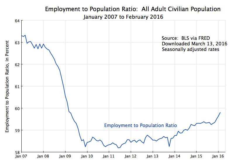 Note the unemployment rate as traditionally referred to (currently 4.9%) is not the simple difference, in percentage points, between the labor force participation rate (62.9% in February 2016) and the employment to population ratio (59.8% in February 2016). The unemployment rate is traditionally defined as a ratio to the labor force, not to population, while the two measures of labor force participation rate and employment to population ratio are both defined as shares of the population. Note that if you take the difference here (62.9% – 59.8% = 3.1% points in February 2016), and divide it by the labor force participation rate (62.9%), one will get the unemployment rate of 4.9% of the labor force. But all this is just arithmetic.
