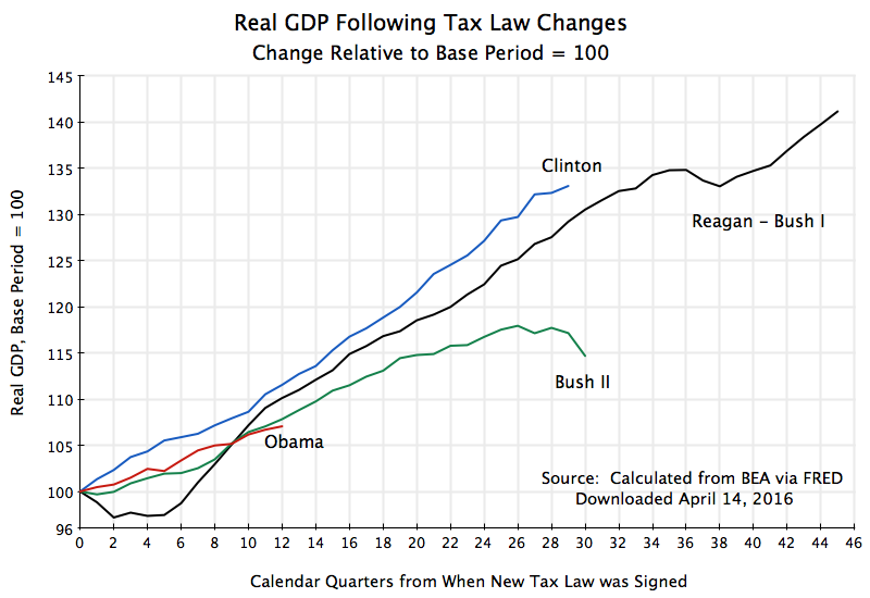 Federal income tax revenues (in real terms) either fell or at best stagnated following the Reagan and then the Bush II tax cuts. The revenues rose following the Clinton and Obama tax increases. The impact is clear.