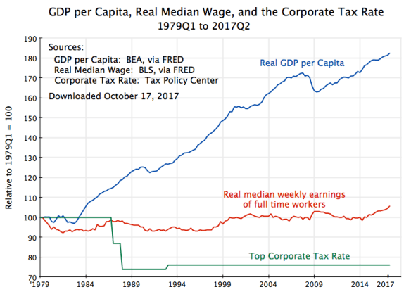 The top corporate tax rate on profits was cut from 46% in the years up through 1986, to 40% in 1987 and then to just 34% in 1988 and thereafter to 1993 (when it was raised to the current level of 35%). Did the cuts in 1987/88 lead to a sharp jump in real wages? There is no indication of that at all in the chart. Indeed, real wages fell by close to 6% between late 1986 and 1990, and then stayed at close to that low level until they started to rise some in the mid to late 1990s. And there is no indication that the small increase in the corporate tax rate in 1993 to 35% led to wages then declining – indeed, they started to rise a few years later.
