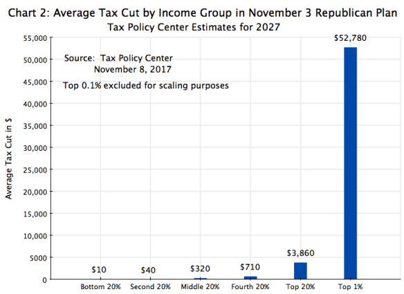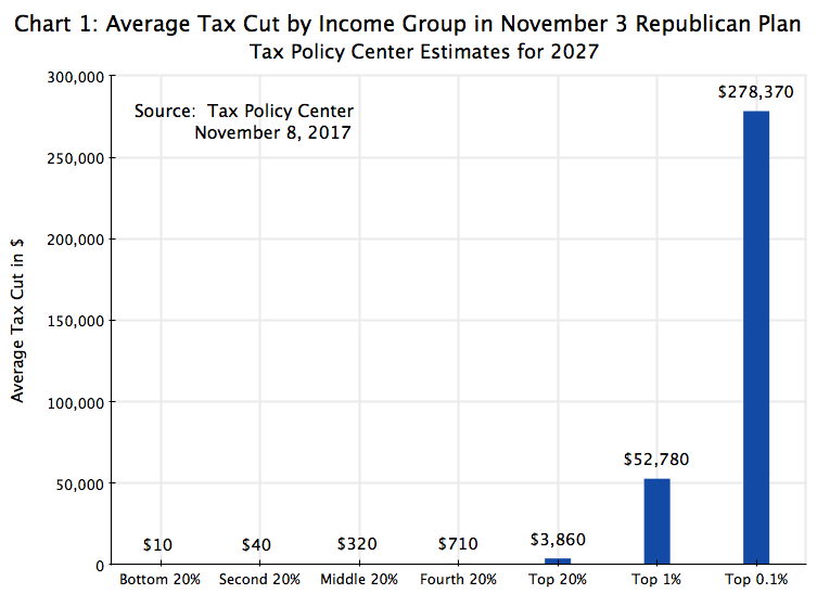 The respected Tax Policy Center (TPC), a non-partisan think tank set up as a joint venture of Brookings and the Urban Institute, released on November 8 its first estimates of the distributional impact of the November 3 Republican tax proposal. The TPC runs a sophisticated micro-simulation model of the US tax system, using a large but anonymous set of tax returns to determine the impact of proposed changes in tax law. The model is similar in nature to models run by the US Treasury and in Congress, but with full disclosure of the results and how they arrived at the estimates that they obtained.