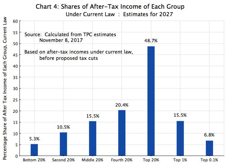 The top 20% account “only” for 49% of the nation’s household incomes (as forecast for 2027), but will obtain 73% of the tax cuts (as also forecast for that year). And one can look at the similar relative amounts for the other income groups.