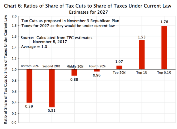 The ratio of what the bottom 20% of the population will be receiving in the proposed tax cuts, to what they would be paying in taxes under current law, is only 0.4. They would be receiving, under the Republican plan, a disproportionately low share of the cuts. And the ratio is even worse for the second 20% (which one might consider as the lower middle class), at just 0.3. At the other end of the scale, the ratio of what the top 1% will be receiving in the proposed tax cuts (47% of the cuts) to what they would be paying in taxes under current law (31% of the taxes) is very generous, at 1.5. And the top 0.1% would enjoy a ratio of tax cuts to what would they pay in taxes under current law of an even higher 1.8.