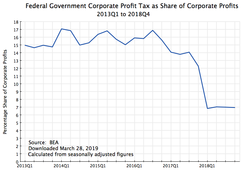 The rate fell from a range of generally 15 to 16%, and sometimes 17%, in the earlier years, to just 7.0% in 2018. And it was an unusually steady rate of 7.0% throughout the year. Note that under the Trump / GOP tax bill, the standard rate for corporate profit tax was cut from 35% previously to a new headline rate of 21%. But the actual rate paid turned out (on average over all firms) to come to just 7.0%, or only one-third as much. The tax bill proponents claimed that while the headline rate was being cut, they would close loopholes so the amount collected would not go down. But instead loopholes were not only kept, but expanded, and revenues collected fell by more than half.