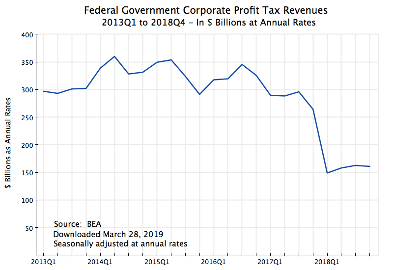 But there is much more in the BEA figures than just GDP growth. The second report of the BEA also includes initial estimates of corporate profits and the taxes they pay (as well as much else). The purpose of this note is to update an earlier post on this blog that examined what happened to corporate profit tax revenues following the Trump / GOP tax cuts of late 2017. That earlier post was based on figures for just the first half of 2018.