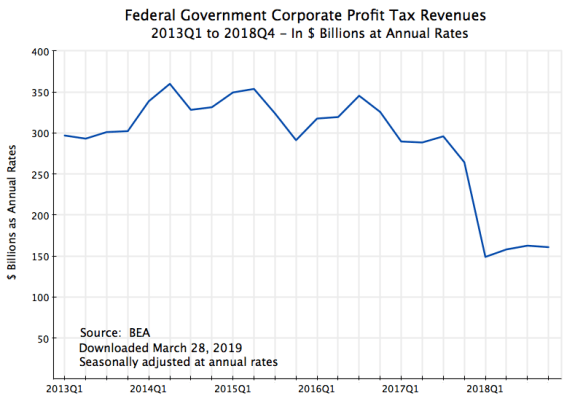 We now have figures for the full year, and they confirm what had earlier been found – corporate profit tax revenues have indeed plummeted. As seen in the chart at the top of this post, corporate profit taxes were in the range of only $150 to $160 billion (at annual rates) in the four quarters of 2018. This was less than half the $300 to $350 billion range in the years before 2018. And there is no sign that this collapse in revenues was due to special circumstances of one quarter or another. We see it in all four quarters.