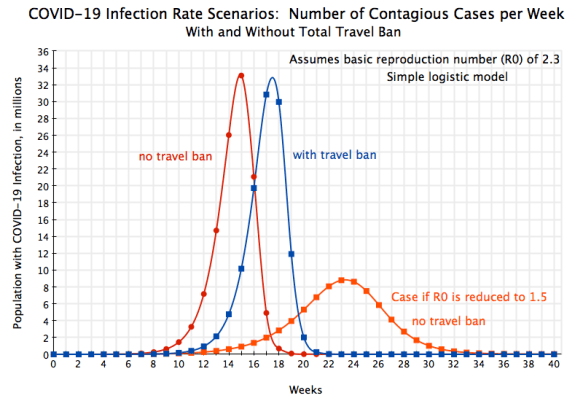 The peak loads on our hospital facilities would be almost exactly the same, with or without a total travel ban. The peak is just shifted by 2 1/2 weeks. In contrast, policies that by social distancing and other such measures reduces the basic reproduction number to 1.5 would have quite a marked effect, reducing the peak load by almost 75%. That could directly translate into possibly thousands of lives that might be saved. A travel ban does not help.