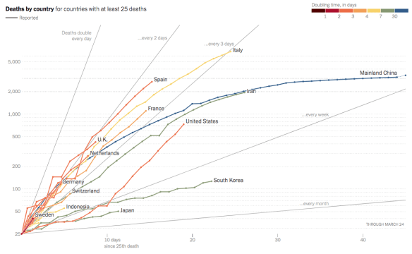 Source: New York Times, “Coronavirus Deaths by U.S. State and Country Over Time: Daily Tracking”, downloaded March 25, 2020, with deaths reported as of 8:20am on March 25.