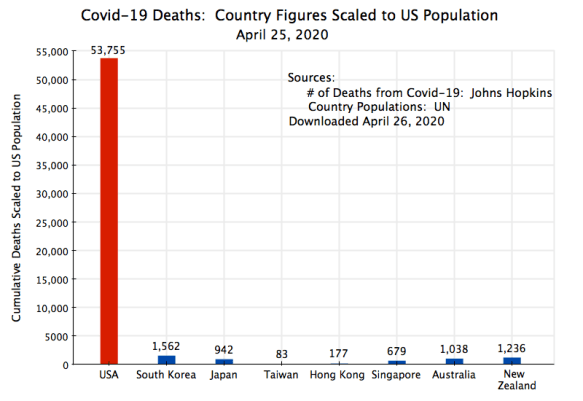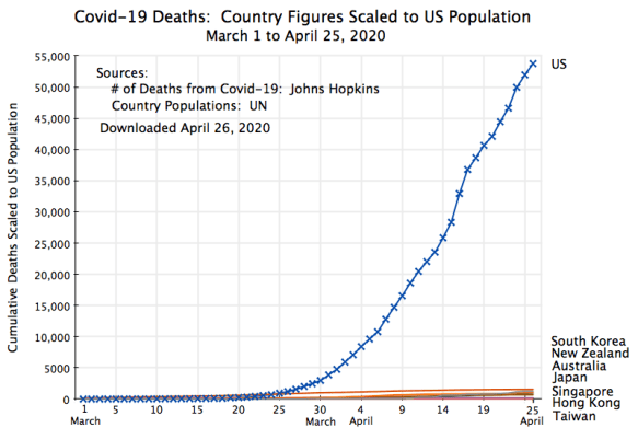 US deaths from the virus totaled 53,755 as of April 25. The figures for each of the seven Asian/Pacific countries are, at this scale, all scrunched up at the bottom of the chart and are almost indistinguishable. Each and every one has done far better than the US.