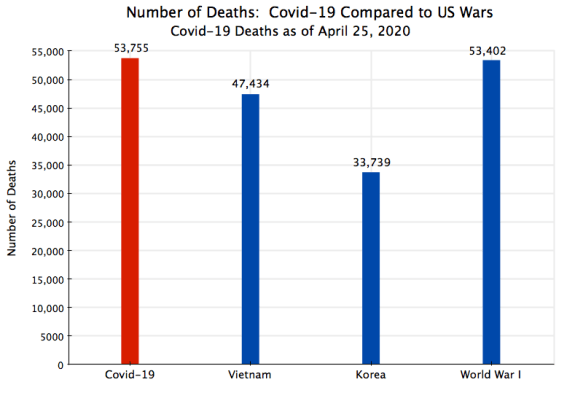 US fatalities from Covid-19 have also just passed another significant milestone. As of April 25 they now exceed the total number of US deaths in combat during World War I: