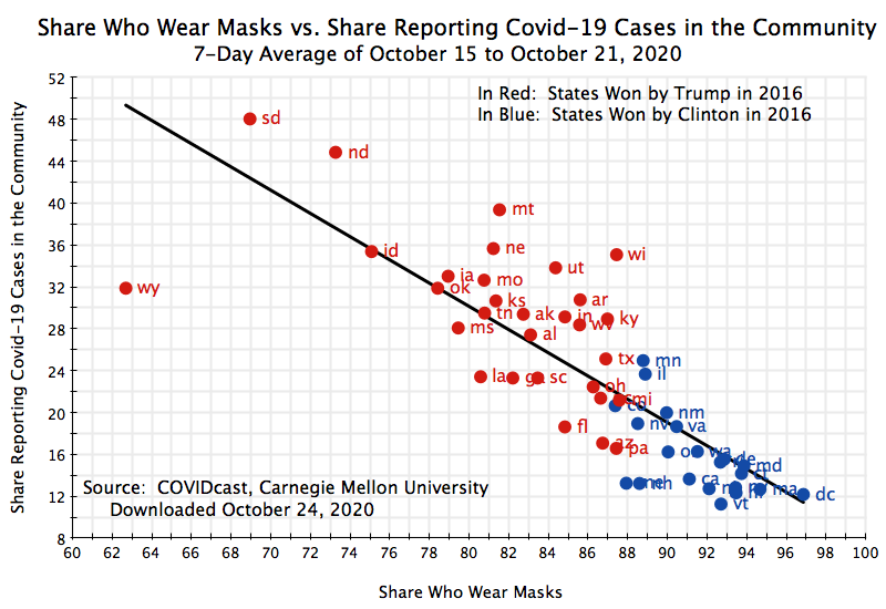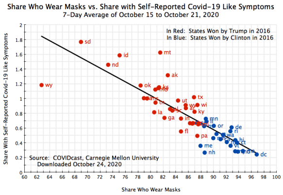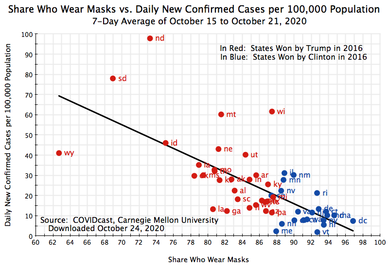 The relationship between those reporting that they wear masks most or all of the time, and the number of confirmed new cases by state (per 100,000 of population, and a seven-day average covering the October 15 to October 21 week), remains significant, negative, and strong. The states where mask-wearing is a higher share of the population routinely wear masks (as reported in the surveys) see a significantly lower incidence of confirmed new cases of Covid-19. The statistical relationship is not as strong as before (the R-squared is 47%), but this is not surprising. The average number of daily new confirmed cases over the 7-day period (October 15 to 21) counts only those with a test result, for a new case, reported over those seven days. The number of people who are sick with Covid-19 will include not just those newly-tested individuals, but also others who have been sick for some time plus individuals with Covid-19 like symptoms who may have the disease but have not (or not yet) been tested. It is not surprising that the correlation of mask-wearing with just a slice of the population who are sick with Covid-19 will be weaker. But the R-squared of 47% is still quite high.