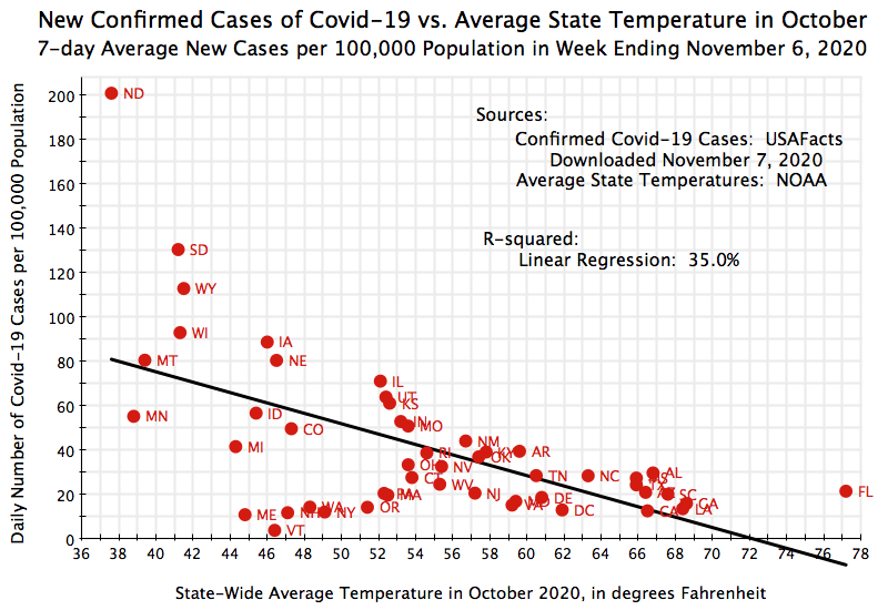 One obvious alternative would be that the sharp increase in cases in the upper mid-west of the US in this period was due to falling temperatures, as the northern hemisphere winter approached. These areas generally grow colder earlier than in other parts of the US. And if one plots the state-wide average temperatures in October (as reported by NOAA) against the average number of Covid-19 cases per day in the week ending November 6 one indeed finds: