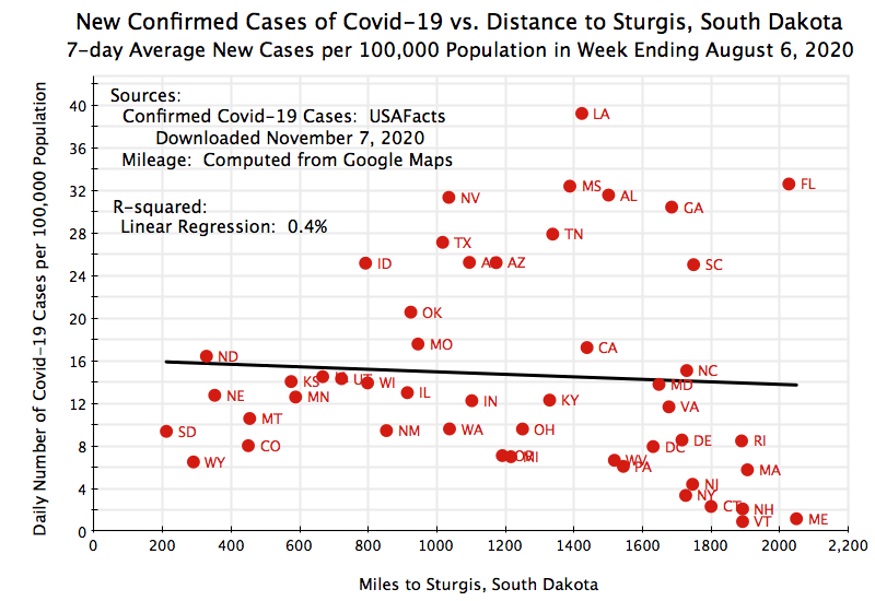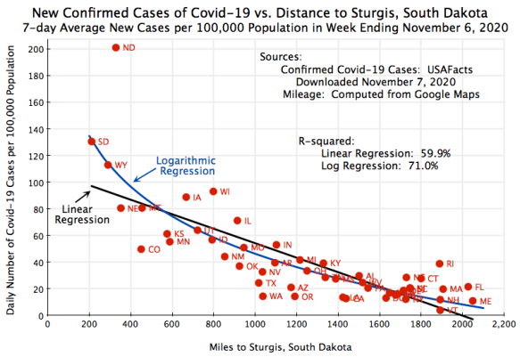 The chart at the top of this post plots the average daily number of confirmed new cases of Covid-19 over the 7-day period ending November 6 in a state (per 100,000 of population), against the distance to Sturgis. The data for the number of new cases each day was obtained from USAFacts, which in turn obtained the data from state health authorities. The data on distance to Sturgis was obtained from the directions feature on Google Maps, with Sturgis being the destination and the trip origin being each of the 48 states in the mainland US (Hawaii and Alaska were excluded), plus Washington, DC. Each state was simply entered (rather than a particular address within a state), and Google Maps then defaulted to a central location in each state. The distance chosen was then for the route recommended by Google, in miles and on the roads recommended. That is, these are trip miles and not miles “as the crow flies”.