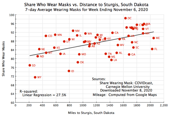 The data in the chart for the share who wear masks by state come from the COVIDCast project at Carnegie Mellon University, and was discussed in the previous post on this blog. The relationship found is indeed a positive one (states geographically further from Sturgis generally have a higher share of their populations wearing masks), but there is a good deal of dispersion in the figures and the R-squared is only 27.5%. This, by itself, is unlikely to explain the Covid-19 rates across states in early November.
