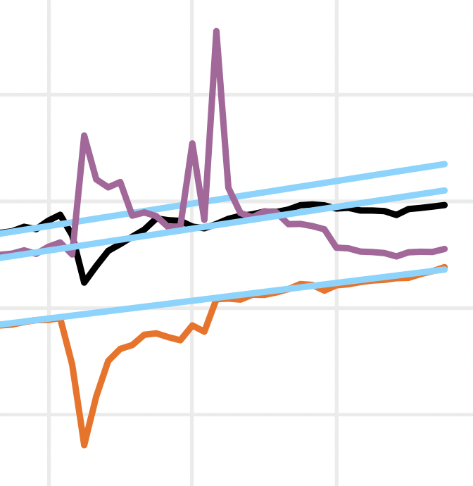 The light blue lines on top of each are the simple linear regression lines of the paths from January 2013 to February 2020 – a period where each of the paths were extraordinarily stable – and with each then extrapolated at that same trend pace through to October 2022. Not only was there little fluctuation in the paths between January 2013 and February 2020, but it was the same path through both the second term of Obama and the first three years of Trump (followed by the crash in Trump’s fourth year). Indeed, the paths were so stable that the light blue lines of the linear regressions almost obscure the black, purple, and orange paths of the underlying data – up to February 2020.