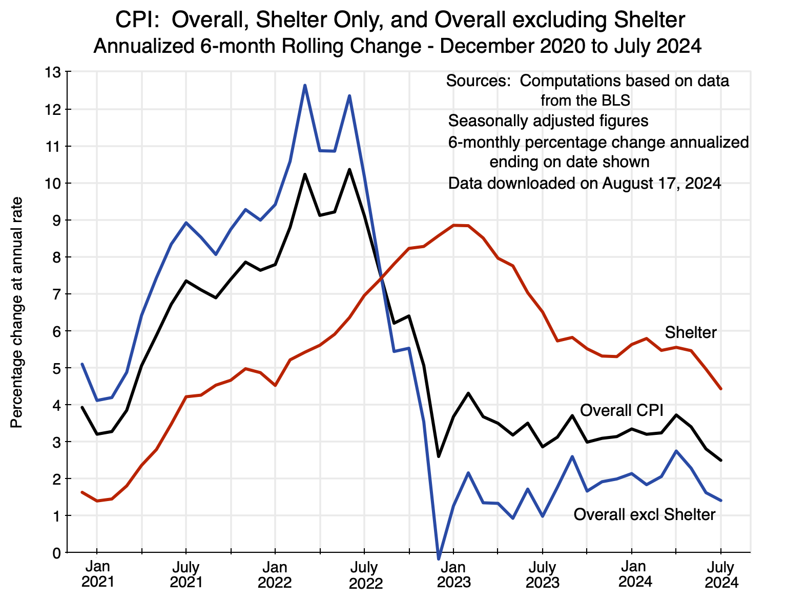 Since mid-2022, the rate of inflation as measured by the overall CPI has generally been in the range of 3 to 4% annualized. Increases in the cost of shelter have kept it relatively high and above the Fed’s target of about 2% per annum. But as seen in the chart, it has recently come down – falling to an annualized rate of 2.5% in the six months ending in July. For everything but shelter, the rate in the six months ending in July was only 1.4%.