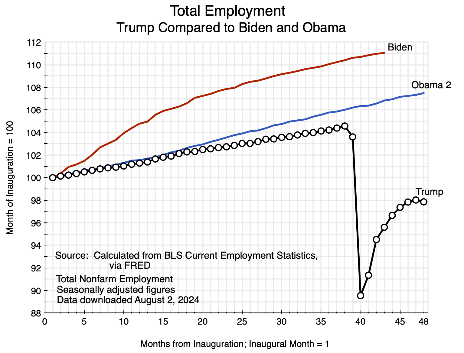 The two charts at the top of this post show how Trump’s record compares to that of Obama and Biden in the two measures most commonly taken as indicators of economic performance – growth in national output (real GDP) and growth in total employment (jobs). This section will focus on Trump’s not-so-special record on growth, while the section following will focus on employment.