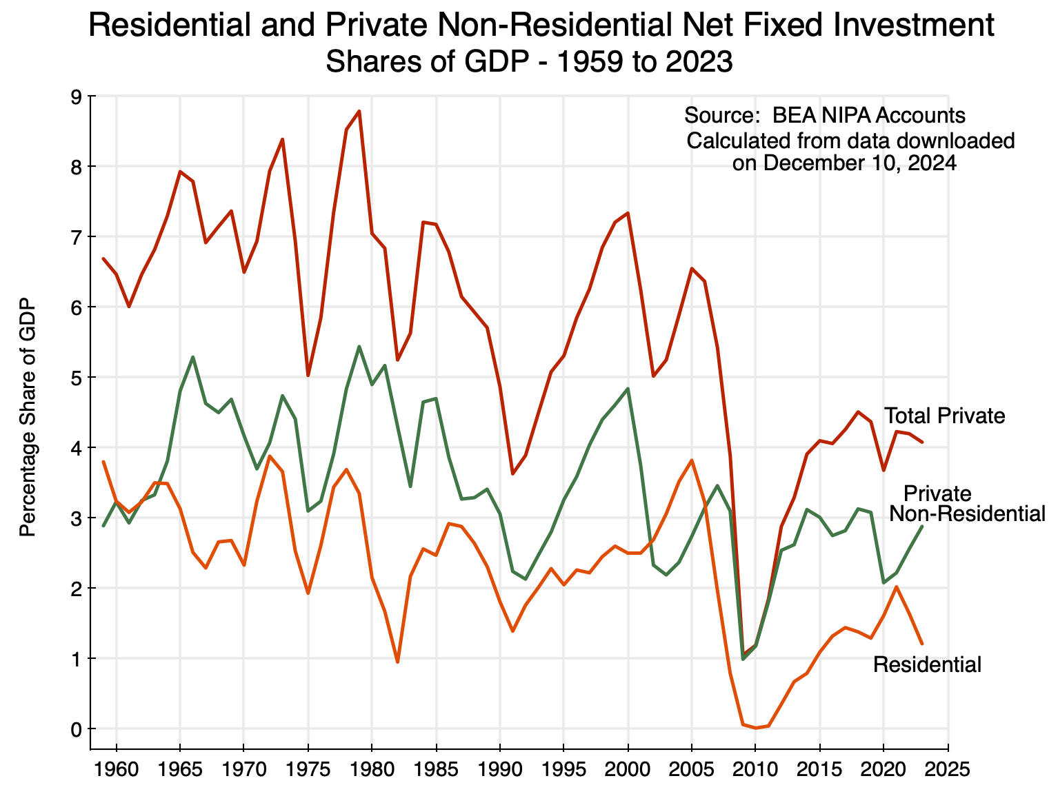 I have included in the chart the share of private non-residential net fixed investment as a share of GDP for context. It has also been declining, although not by as much as net investment in residential fixed assets. Net residential investment fell to essentially zero as a share of GDP in 2009-11, following the bursting of the housing bubble, and then recovered to only between 1 and 2% of GDP. As of 2023 it was around 1% of GDP – well below where it was in the 1960s and 70s.