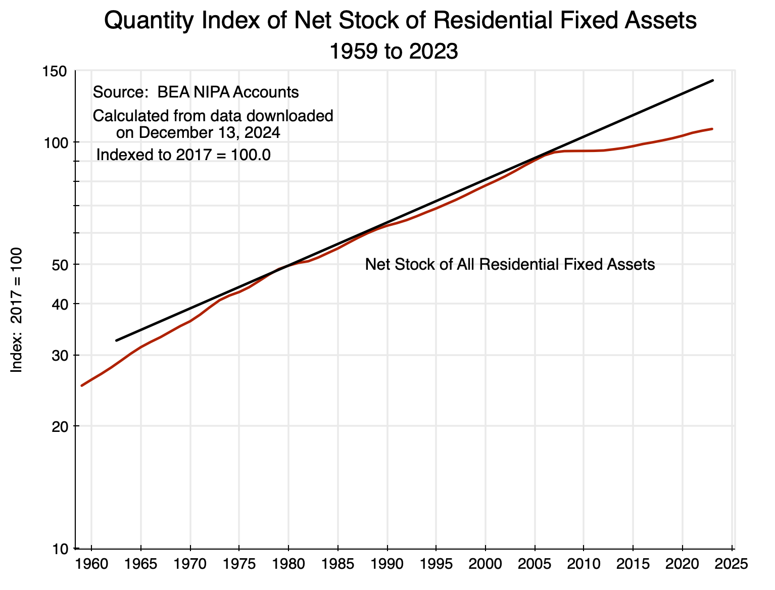 The chart is on a logarithmic scale on the vertical axis. A straight line on a logarithmic scale will reflect a constant rate of growth (with that rate of growth equal to the slope of the line). The straight line in black is thus the trend growth in the stock of residential fixed assets between around 1980 and 2007. It closely tracks that growth over the 1980 to 2007 period, with little fluctuation around it. But then the growth in housing assets diverges sharply below the previous trend. The stock of housing would have been 32% higher in 2023 had it kept growing at its pre-2007 trend. That is huge. It should be no wonder that home prices were consequently bid up by so much.