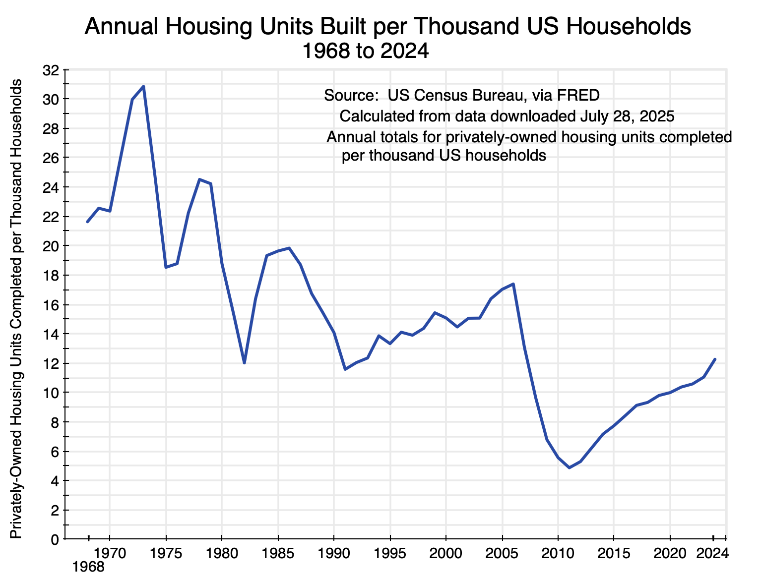 The 10-year average number of new housing units being built each year per thousand households was 24.2 in the 1970s. The most recent 10-year average (ending in 2024) was just 9.9 (60% less than in the 1970s), and hit a low of just 7.1 in 2018 (70% less). Home building has not kept up.