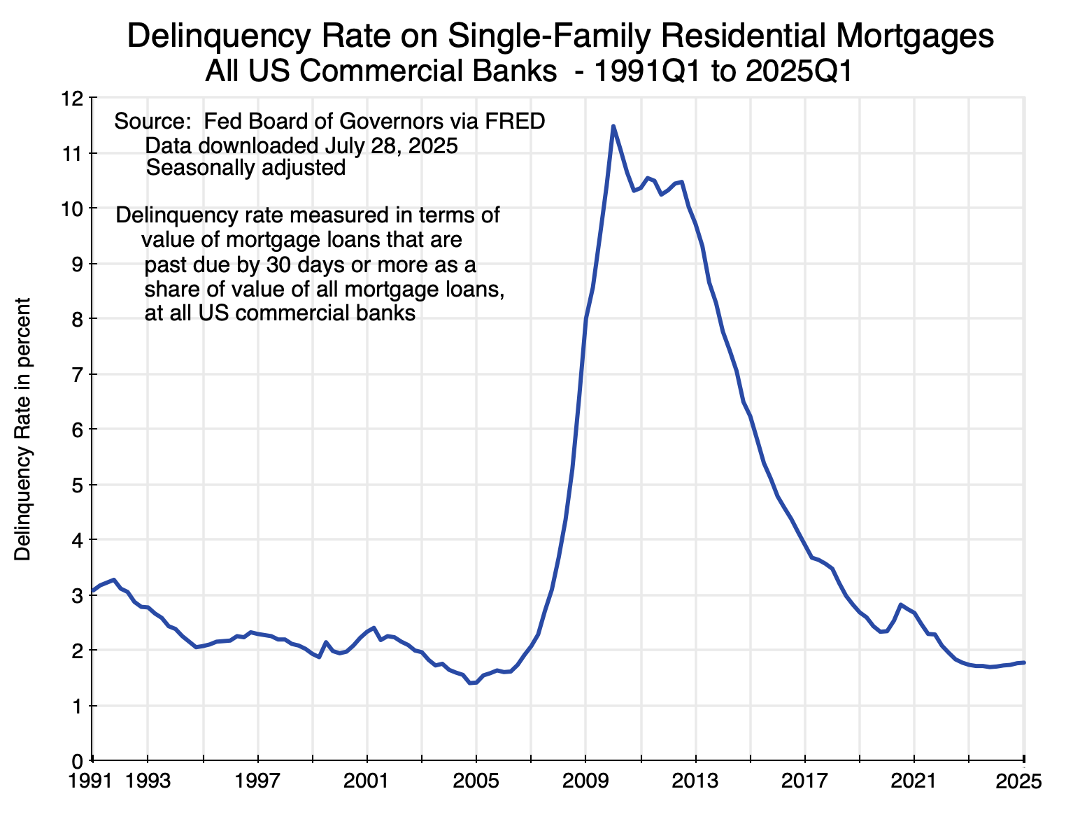 This then changed in the period leading up to 2006. Home prices in real terms reached a peak of 195 in 2006 and then fell – at first slowly and then quickly – as the demand-led housing bubble burst. Financial markets discovered that home prices – driven as they had been by easy mortgage lending boosting demand – would not keep going up forever, as mortgage delinquency rates rose: