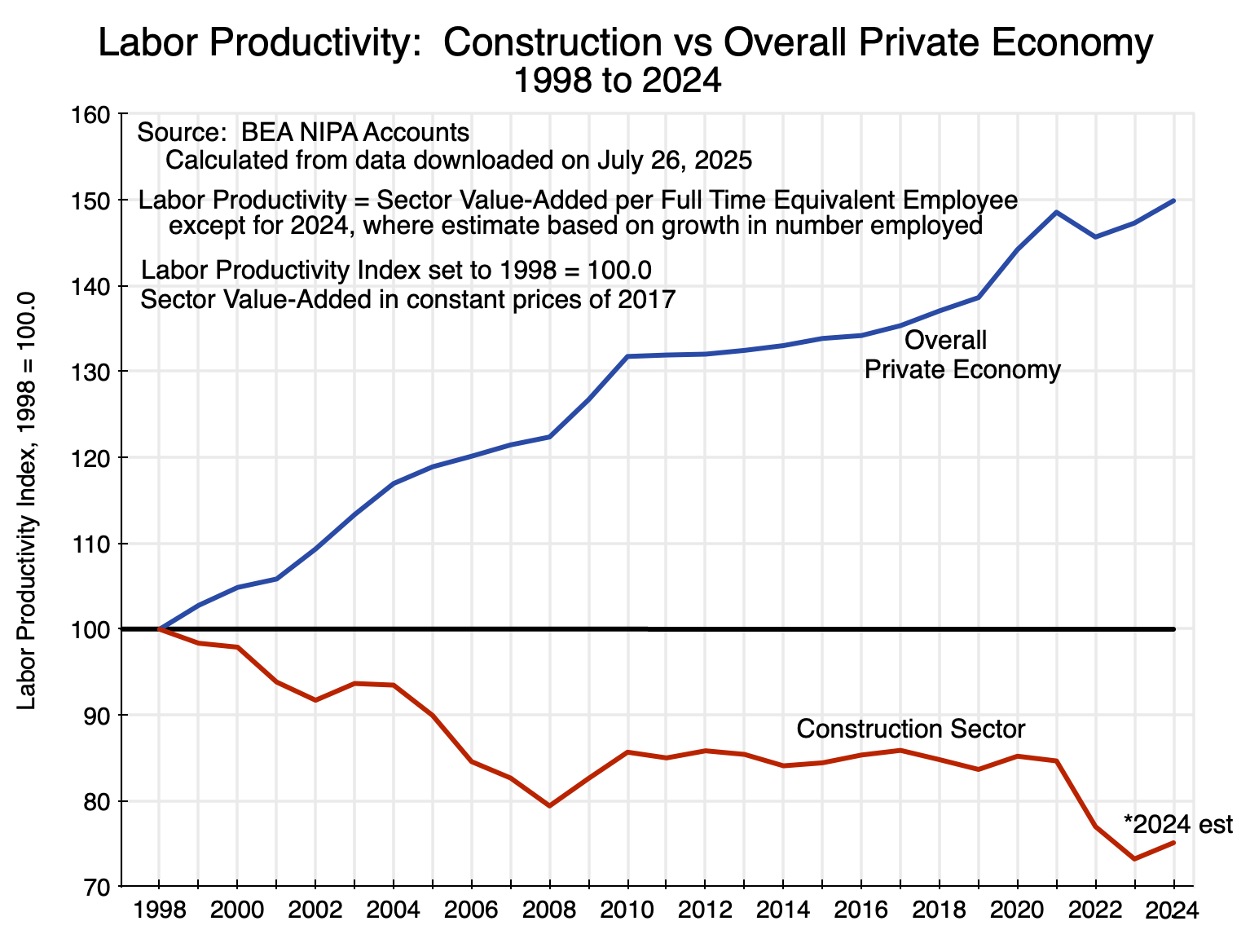 In contrast, labor productivity for the overall private economy grew by 50% between 1998 and 2024 – an annual rate of growth of 1.7% a year. While the 1.7% per year might not appear to be high, it compounds over time. If labor productivity in construction had grown at the same pace as it had in the overall private economy, the construction sector in 2024 would have been producing twice as much per worker (=1.50/0.75) as it was.