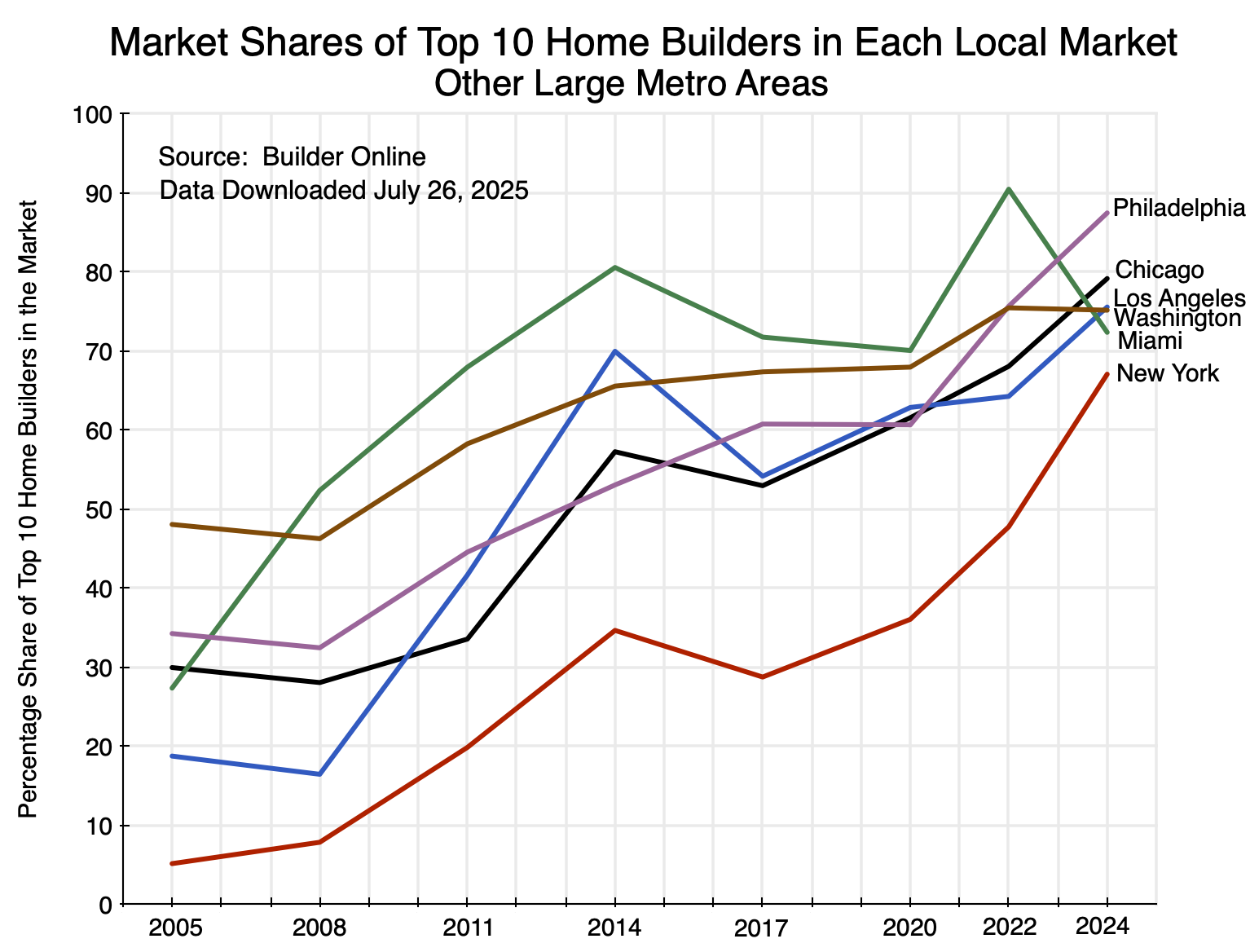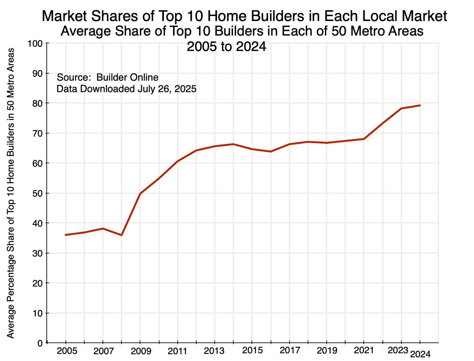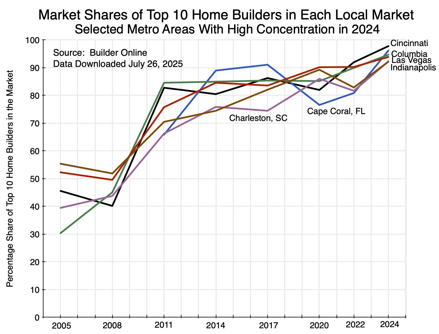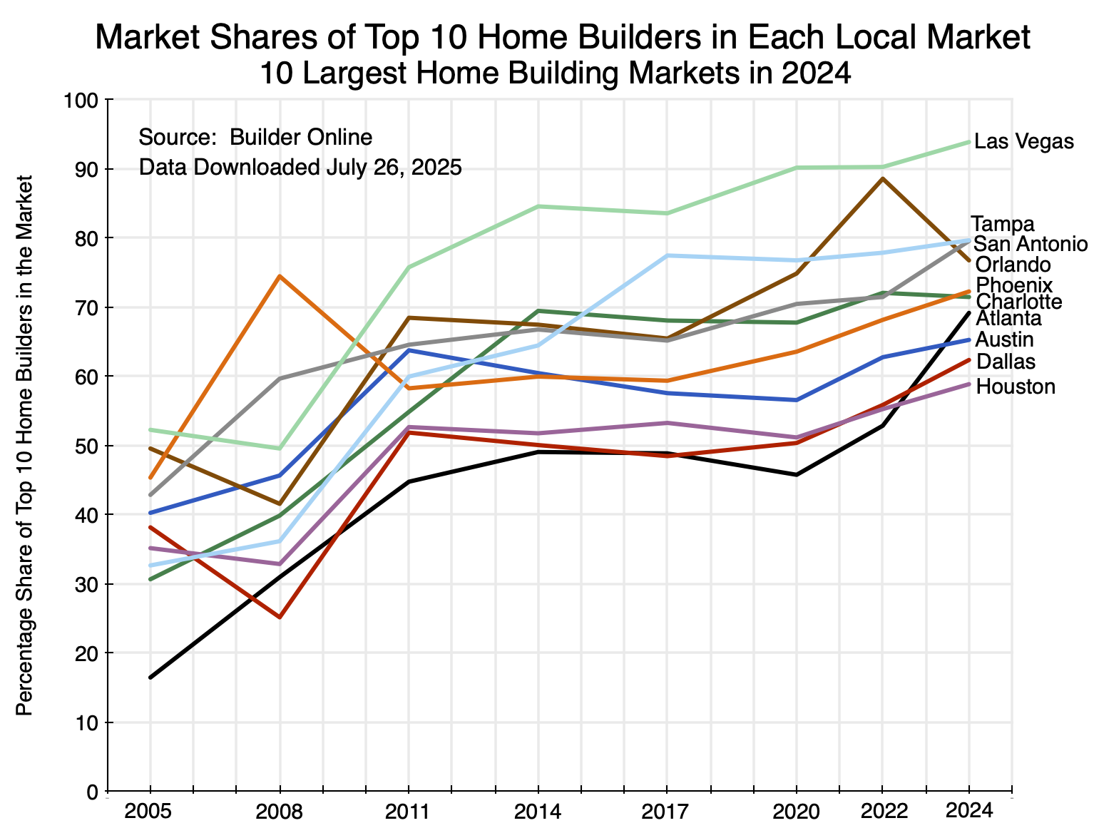 One can also look at other sets of markets. For example, 11 of the top 50 markets in 2024 saw market shares of the top 10 home builders in each accounting for more than 90% of the number of new homes built and sold. A few were among the smaller markets, but there was also:
