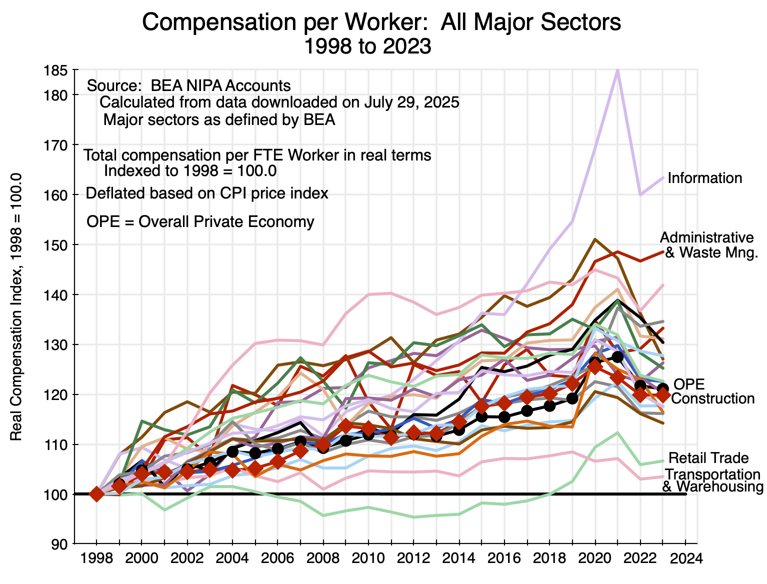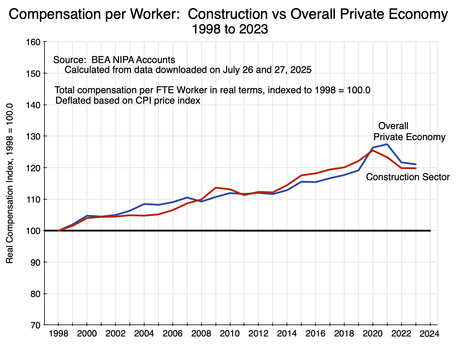 But total compensation per worker in the construction sector since 1998 has not gone down. It has gone up. And it has gone up at a remarkably similar pace as compensation per worker in the overall private economy: