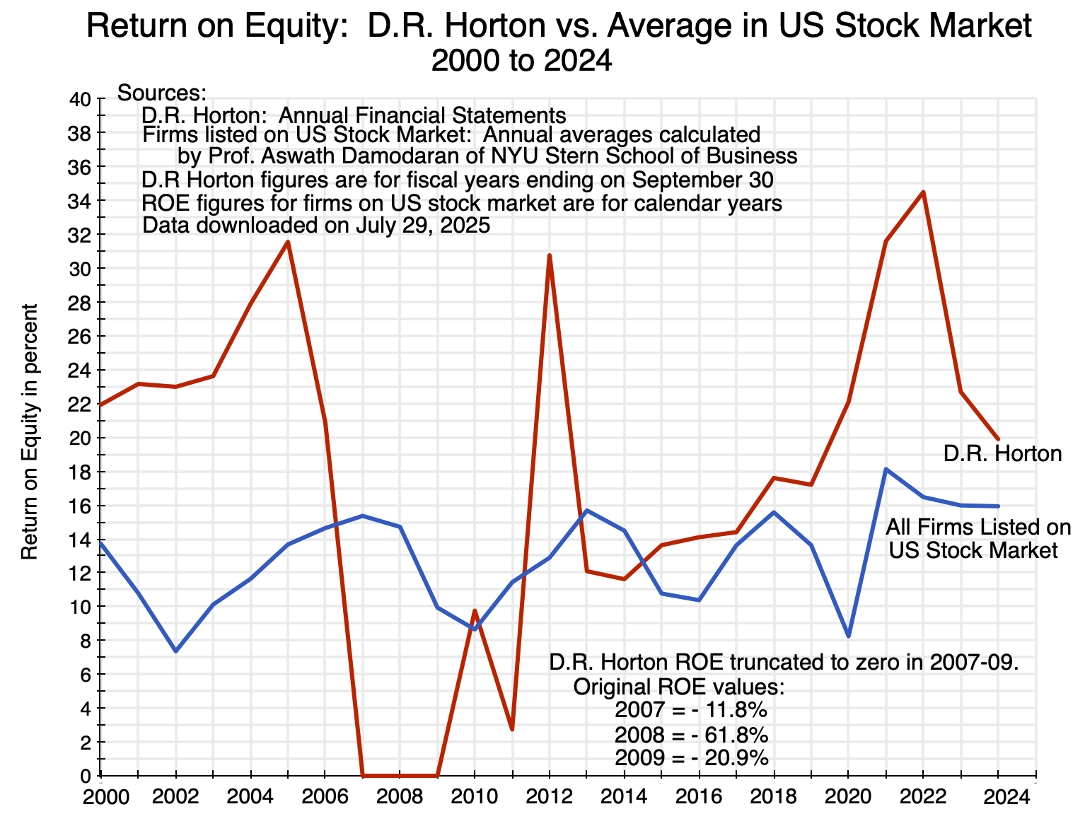 Another indication of profitability can be found in the income statements of the different home builders, with measures such as the return on equity (ROE) generated in any given year. I looked at the case of D.R. Horton – currently the largest home builder in the US in terms of the number of homes built each year (as well as in gross revenues). ROE figures can be found in the various annual reports of D.R. Horton. These were then compared to the overall average ROE figure of all US publicly traded firms (compiled annually by Professor Aswath Damodaran of NYU, for over 6,000 publicly traded firms on US stock exchanges):