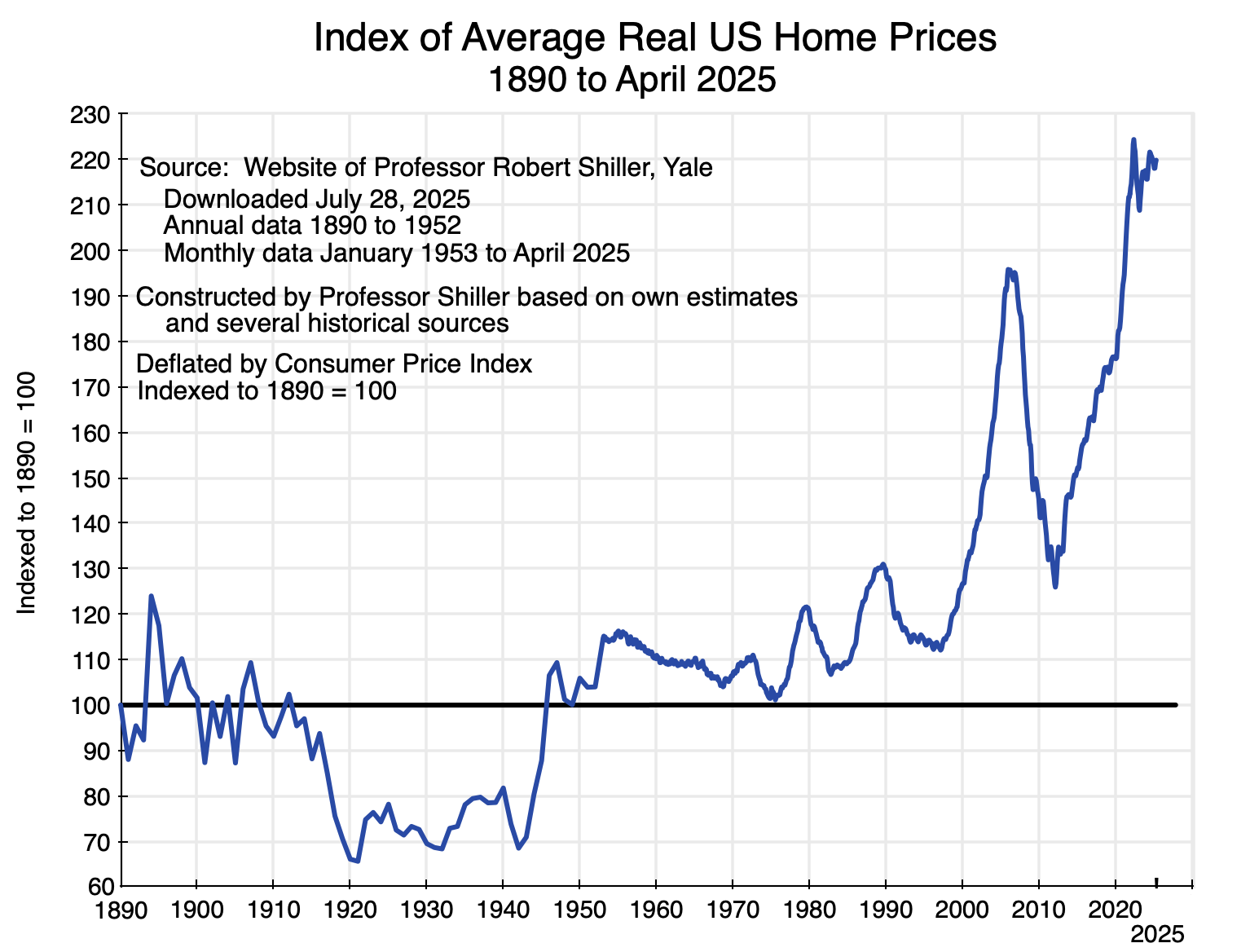 Home prices in the US are exceptionally high. The chart at the top of this post provides an estimate of real home prices (adjusted based on the general CPI) for the period from 1890 (with an index value set equal to 100) through to April 2025. The data were assembled by Professor Robert Shiller of Yale, and was originally constructed for his book Irrational Exuberance. The data in it is now updated monthly, and is available at Shiller’s personal website.