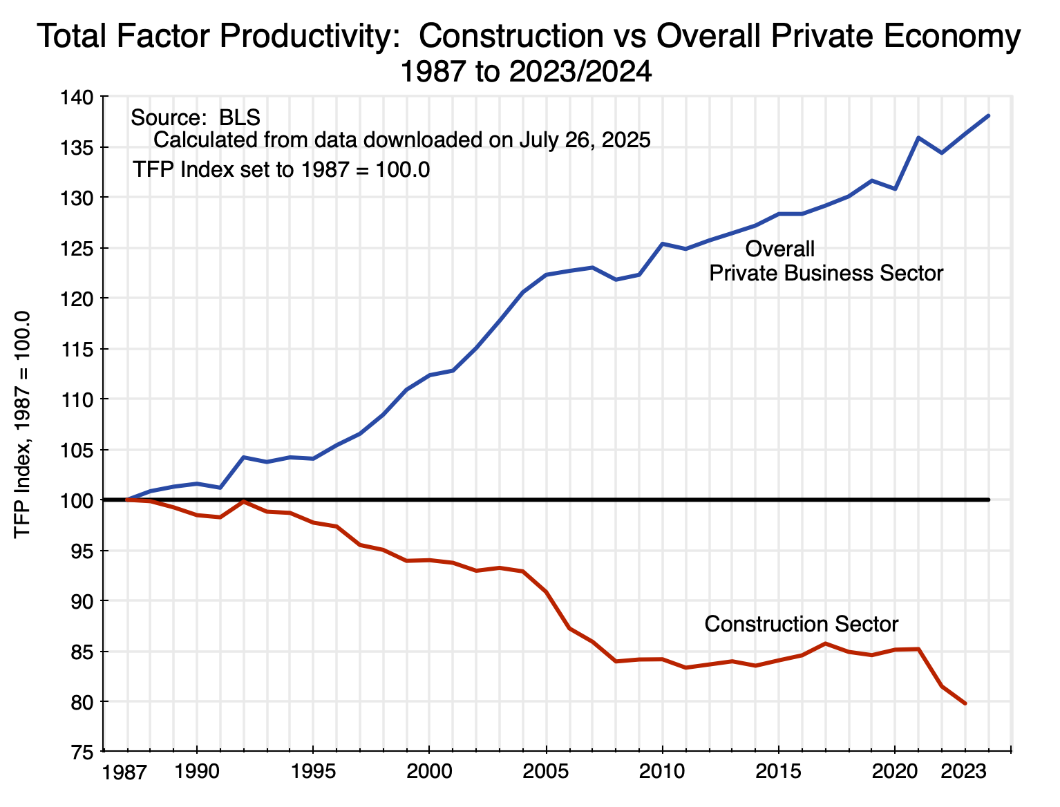 The earliest year in this data set is 1987, and the respective TFP estimates have each been indexed to 100 in 1987. Since then, total factor productivity for the overall private business sector grew to an index value of 136.3 as of 2023 and 138.1 as of 2024 – an average growth rate of 0.9% per year since 1987. Total factor productivity in construction fell, however, to an index value of 79.7 in 2023 – a fall of an average 0.6% per year since 1987. The figure for 2024 is not yet available. Had TFP grown in construction at the average for the overall private business sector, the construction sector in 2023 would be producing 71% more ( = 136.3/79.7) per unit of labor and capital input. That is huge.