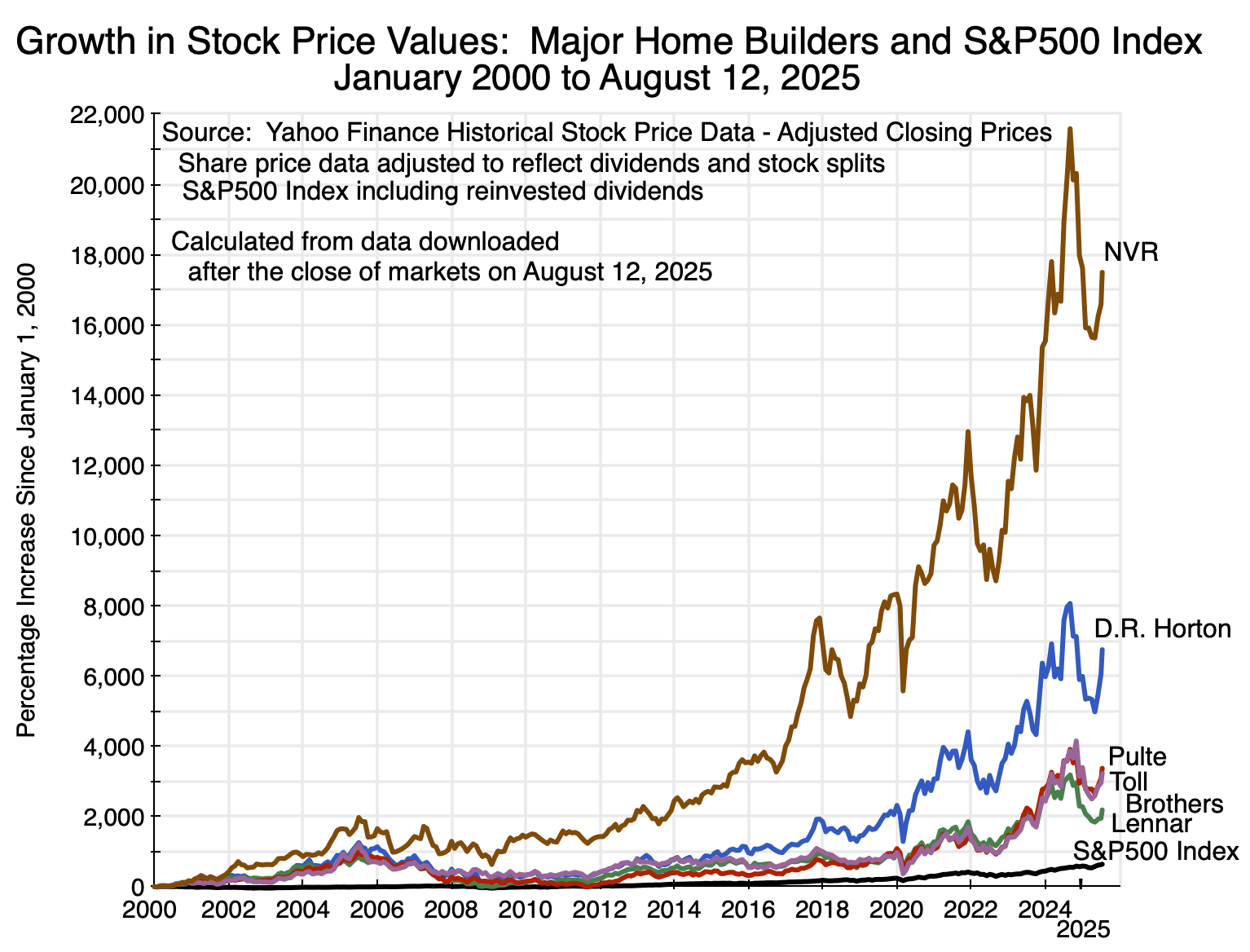 The chart shows the percentage increases in the stock prices (including reinvested dividends and capital gain distributions, and adjusted for any stock splits) of the five largest homebuilders in the nation (in terms of gross revenues earned in 2024) over the more than 25 years from January 2000 to August 12, 2025. For comparison, the percentage increase in an investment in the S&P500 stock index (and again including reinvested dividends and any other distributions) over the same period is also shown. The equity price figures were obtained from Yahoo Finance historical stock data. For example, see here for the figures on D.R. Horton.
