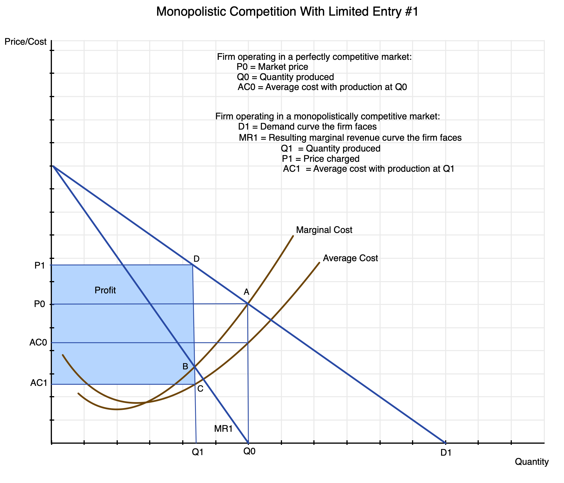 When they are producing at point B with quantity Q1, their average cost of production will be at point C with cost AC1. And they will be able to sell their output at point D on the demand curve, i.e. at price P1. Their profits will then be equal to quantity produced Q1 times the price they will receive P1 minus their average cost AC1, i.e. the area shown in the box in light blue in the diagram. They are producing less than they would in a situation of perfect competition, but they are receiving a higher price and their average cost will be less. Since their marginal revenues are below their marginal costs for production above that point, scaling back production to Q1 from what it would be under perfect competition will always be more profitable for such firms.
