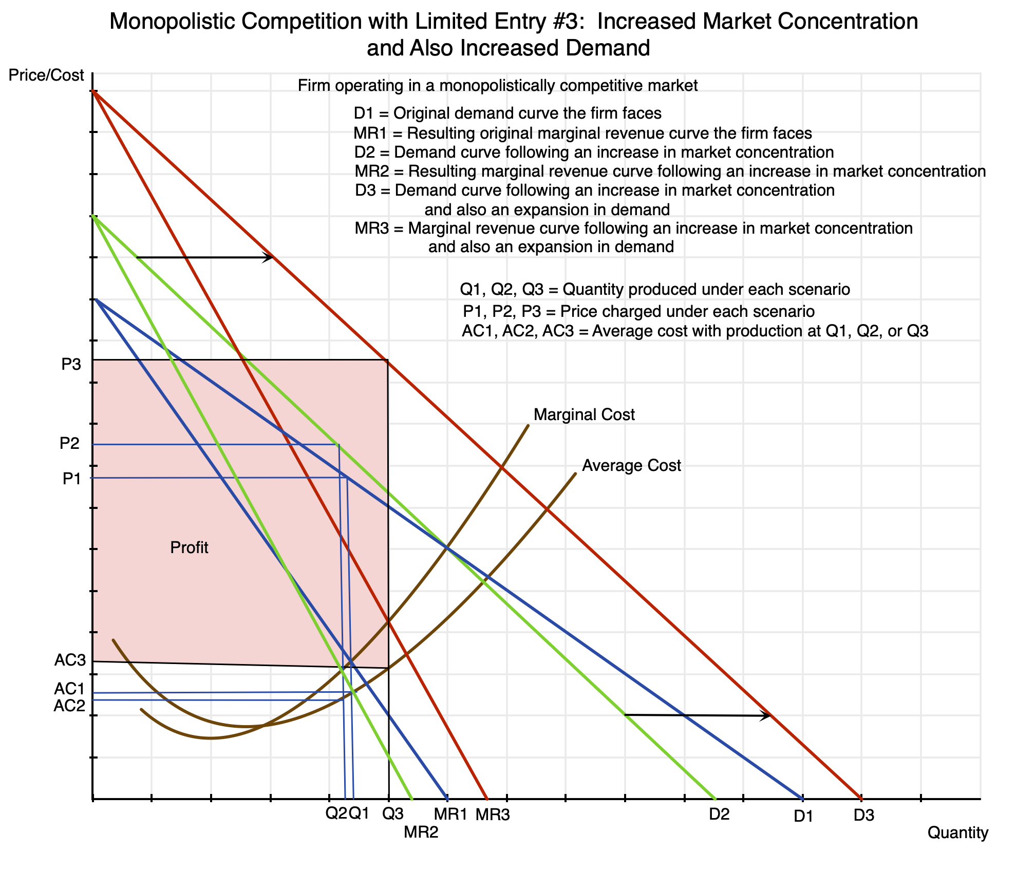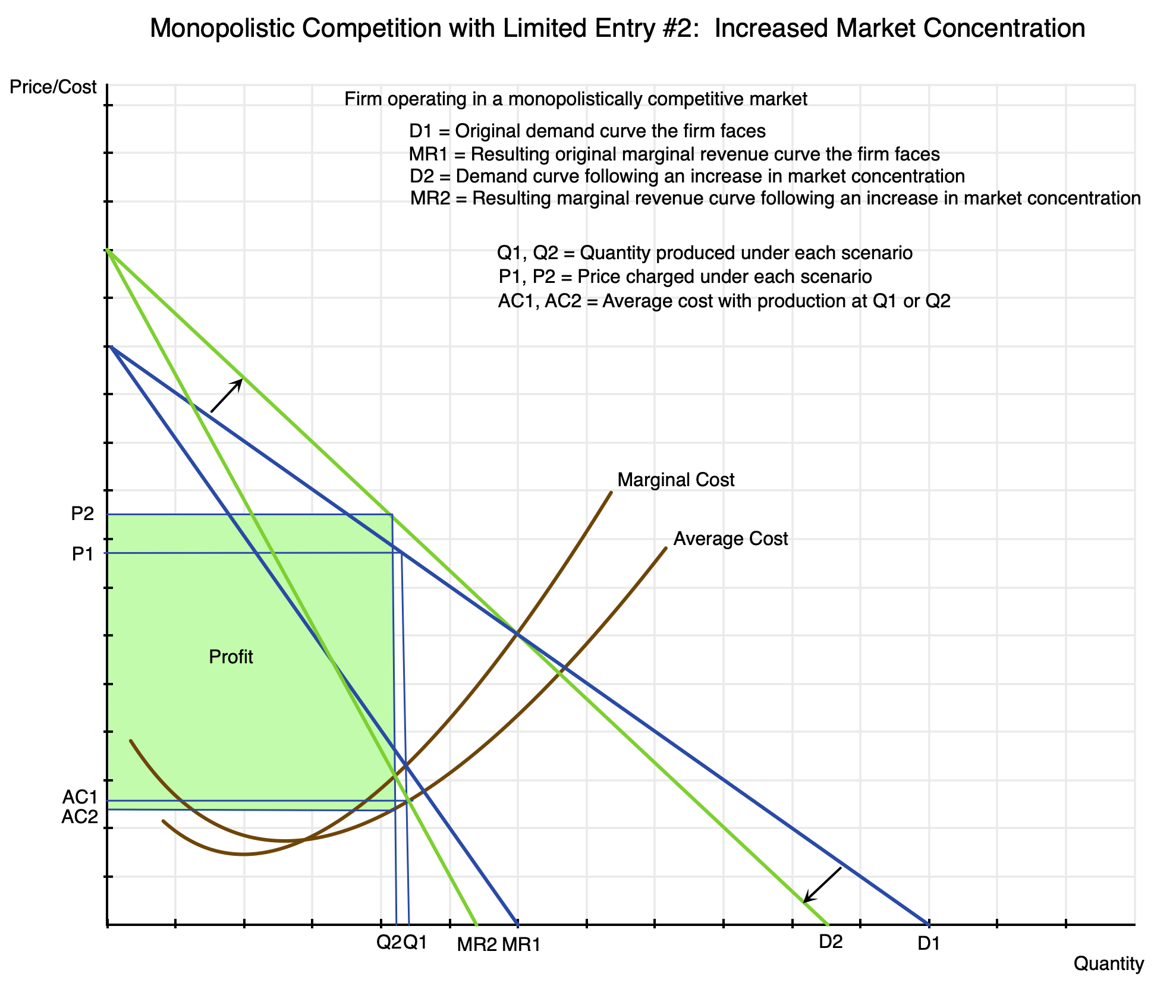 Starting from this, one can then look at what will happen to the firm’s choice on how much to produce (and the impact on its profitability) if the market should become even more concentrated. This now deviates from the standard textbook treatment of monopolistic competition, in that in the standard treatment, it is assumed that the high profit the firm is able to earn (shown as the box in light blue in the chart above) will attract new competitors. The new competitors will add to production in the market, which will lead the prices to be bid down and possibly increase costs for all (as they compete to buy some of the inputs needed in production). This will reduce profits for the firms, and it is assumed (in the standard treatment) that new entrants will continue to come in as long as exceptional profits are being made.