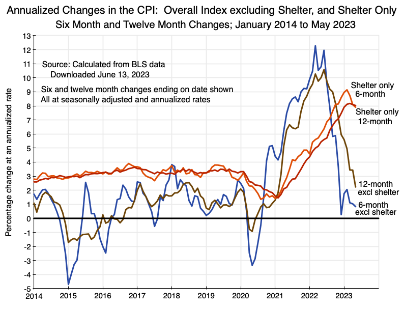 Thus for close to two-thirds of households – and an even higher share of the population – the 3.5% rate of increase in the overall CPI is not really relevant. Their monthly housing payments – if any – are unchanged. The overall CPI inflation rate has been pulled up by the increases in the cost of shelter (as measured by the BLS for the CPI), but the cost of shelter for close to two-thirds of US households has not changed at all. What is relevant for those households is not the overall CPI, but rather the everything but shelter component of the CPI. And that has been rising at a rate of only 2.3% over the past year.