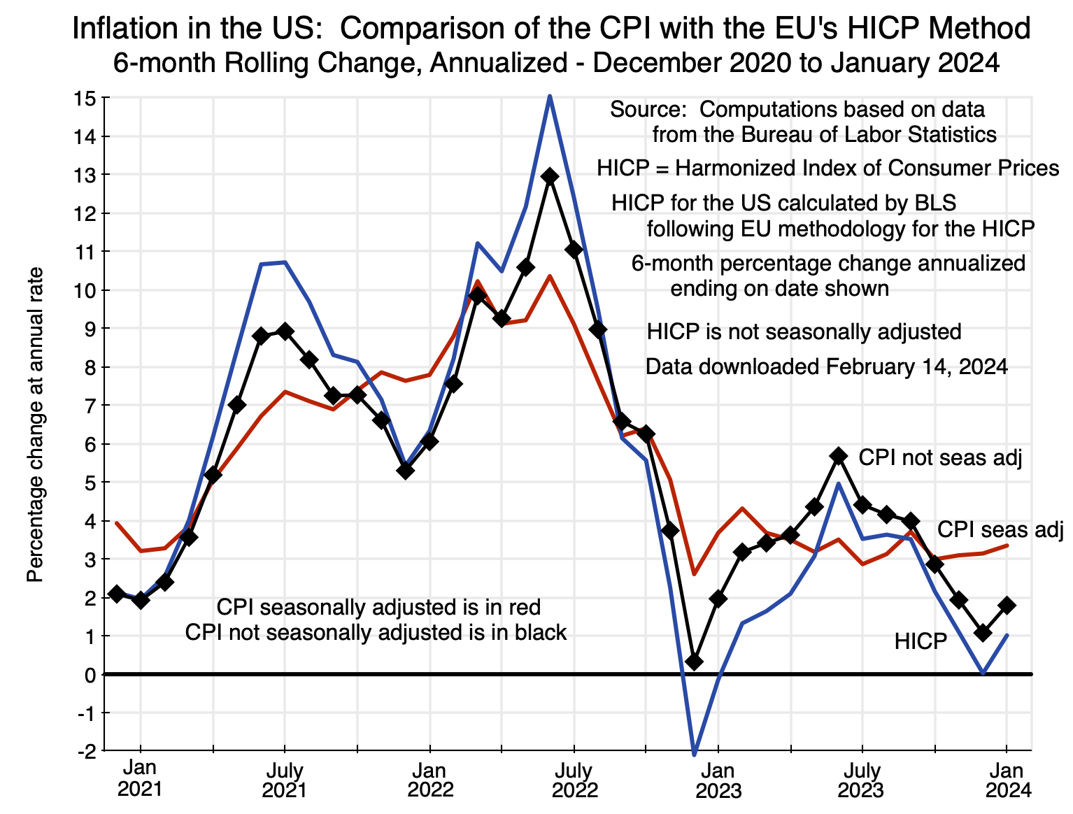 By far the most important lies in how – once again – the cost of shelter is treated. Working out how to include the cost of shelter (or housing) in an inflation index is always difficult, as was discussed above. For the CPI and the PCE deflators, the BLS and the BEA both provide estimates of imputed rental rates for owner-occupied homes, where the imputed rates are based on a survey of what is being paid on actual rented homes. But imputed payments are not actual payments. The statisticians at the European Union concluded that – due to there not being any actual monetary transaction involved – the best way to handle this would be simply to exclude any such “cost” in their index of consumer inflation. They call their equivalent to the US CPI the HIPC (for Harmonized Index of Consumer Prices), and its construction was discussed in an earlier post on this blog, and it simply leaves out housing.