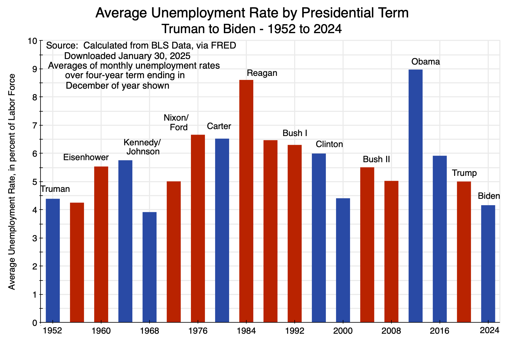 These figures were calculated from BLS data (via FRED), and are the simple averages of the unemployment rate over presidential terms from January of their inauguration year through to December of their final year. (One could reasonably argue that the period should start only in February of the inauguration year and end in January, but that one month shift would not lead to a significant difference in the four-year average. Plus, as I write this I do not yet have the unemployment statistic for January 2025.)