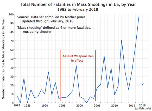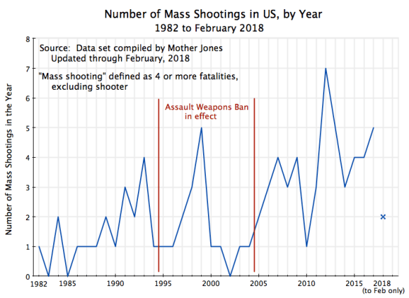 The chart at the top of this post shows the number of mass shooting events each year from 1982 through 2017, plus for the events so far in 2018 (through end-February). The numbers were low through the 1980s (zero, one, or two a year), but then rose. The number of incidents per year was then generally less during the period the Assault Weapons Ban was in effect, but with the notable exceptions of 1998 (three incidents) and especially 1999 (five). The Columbine High School shooting was in 1999, when 13 died and 24 were wounded.