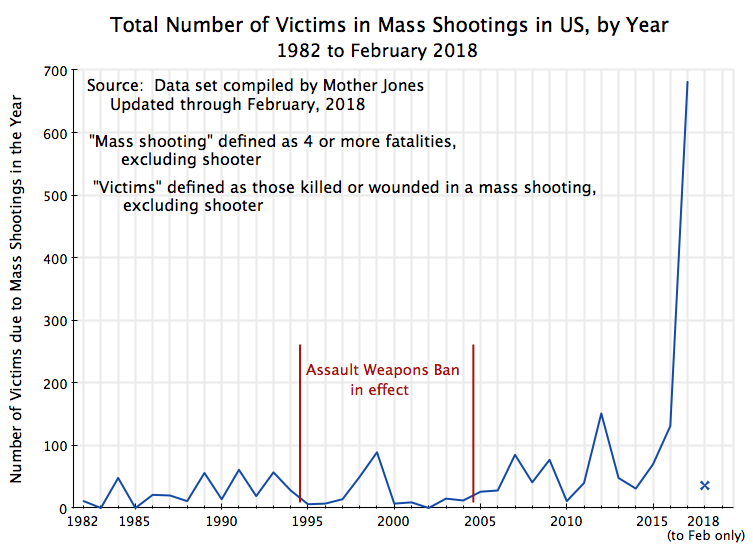 The chart at the top of this post shows the number of mass shooting events each year from 1982 through 2017, plus for the events so far in 2018 (through end-February). The numbers were low through the 1980s (zero, one, or two a year), but then rose. The number of incidents per year was then generally less during the period the Assault Weapons Ban was in effect, but with the notable exceptions of 1998 (three incidents) and especially 1999 (five). The Columbine High School shooting was in 1999, when 13 died and 24 were wounded.