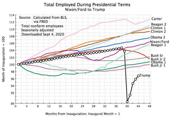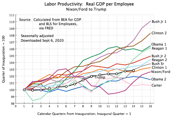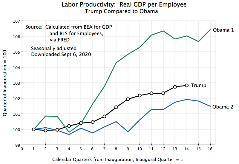 For a rough estimate of the relative importance of these three factors – labor, capital, and productivity – I developed an extremely simple Cobb-Douglas production function model to simulate what could be expected. Despite being simple, it turned out to work surprisingly well both in terms of tracking what actual GDP was (for given employment levels) and in tracking the trend path for GDP given the trend paths of labor, capital, and productivity.