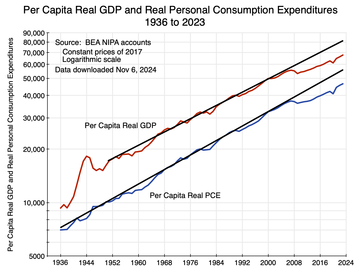 That is, while the economy recovered from the 2008 collapse – in the sense that it returned to the full utilization of the labor and other resources available to it – economic output (real GDP) with that full utilization of resources was stubbornly below (and remained stubbornly below) what it would have been had it returned to its prior growth path. The economy had followed that path since at least the late 1960s (as seen in the chart above). Indeed, that same growth path (in per capita terms) can be dated back to 1950 (as the previous post on this blog showed).