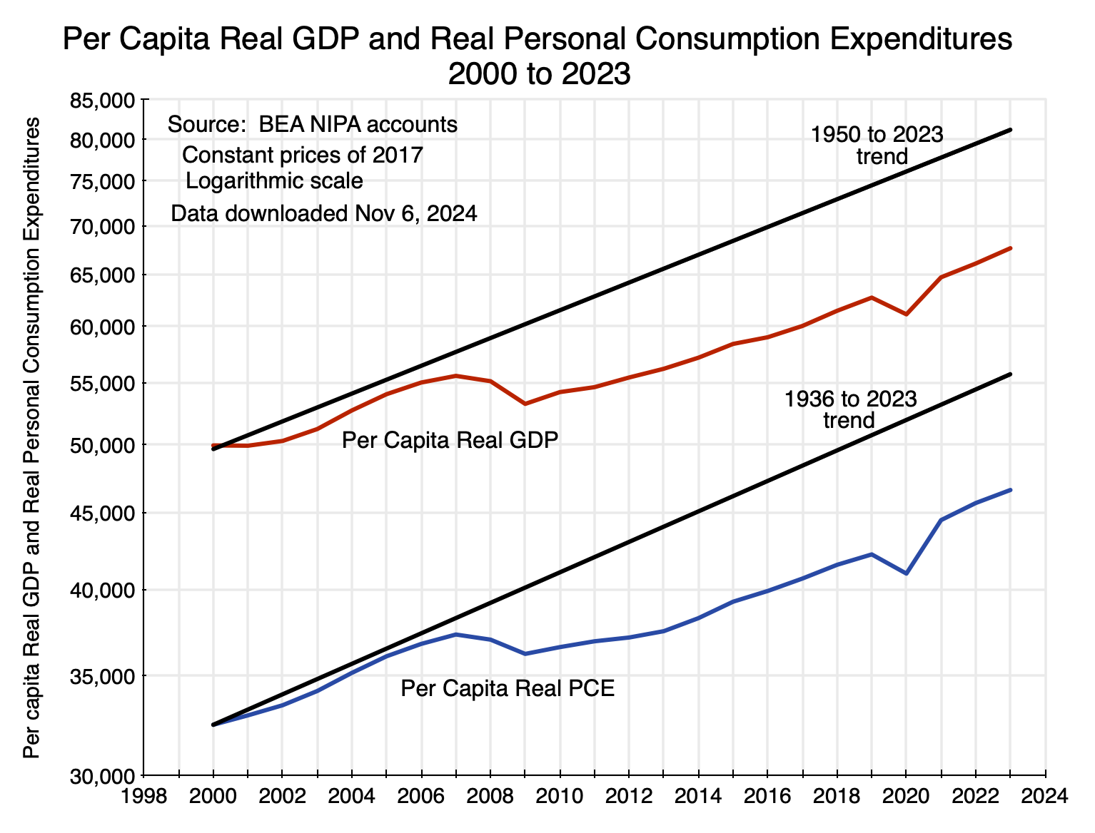 The line in orange shows what GDP would have been had labor growth continued after 2007 on its pre-2008 trend path (the path drawn in Chart 2 above), while capital grew not along its trend but rather as measured. Here one needs to take into account that the growth rate of actual employment and the growth rate of the labor force will only match between periods when the unemployment rate was the same. Thus comparisons should be limited to periods when the economy was close to full employment, such as between 2007 (when unemployment averaged 4.6%), 2016 to 2019 (annual unemployment rates of 4.9% to 3.7%), and 2022/23 (annual unemployment rates of 3.6%). That is, the “peaks” seen in the orange line in 2009 and again in 2020 are not significant, as they reflect labor not being fully used. This was not because the labor force was not available but rather due to the disruptions of the downturns in those years.