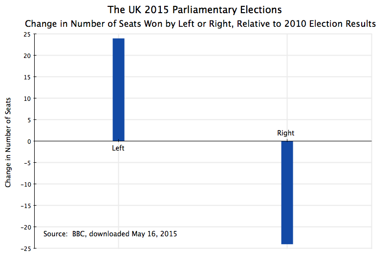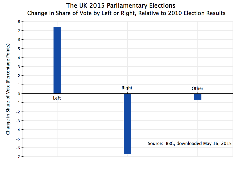 But while undoubtedly a defeat for Labour and a victory for the Conservatives (who gained a majority of the seats in Parliament, and hence will no longer need to rule in a coalition), one should not jump to what would seem to be the natural conclusion that voters shifted to the Right while abandoning the Left. That did not happen. Given the rules of the British electoral system, where Parliamentary seats are won by whomever gained most votes (not necessarily a majority) in each of the 650 constituencies (a “first past the post” system), plus the rise of significant third parties on both the Left and the Right, swings in voter support between Left and Right were quite different from swings in the number of seats won by the major parties.